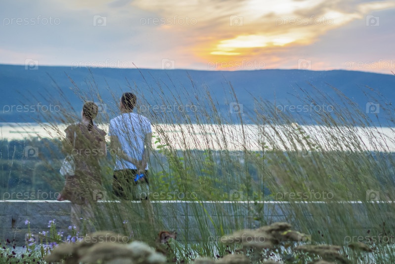 Пара стоит на краю смотровой площадки, наблюдая с высоты красивый закат. Летний абстрактный фон природы с травой на лугу и закатным небом. Природный ландшафт