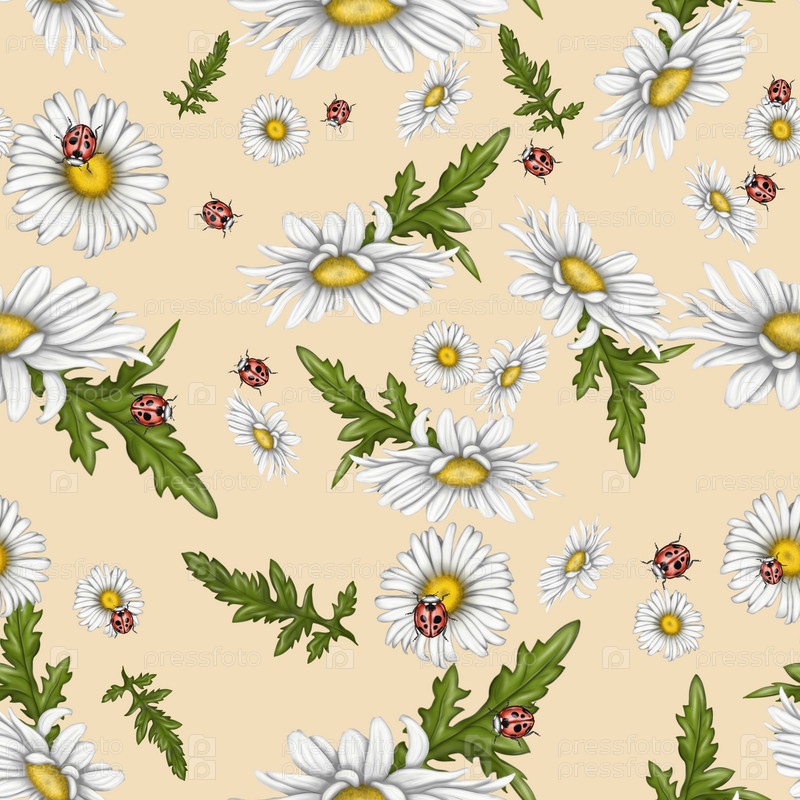 Бесшовный фон для печати. Иллюстрация цветков ромашки. Яркие красивые цветы на светлом фоне