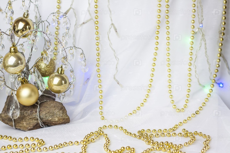 Новогодний фон с елкой, на которой висят маленькие золотые шарики. Выборочный фокус, картинка для фона. концепция Рождества и Нового года