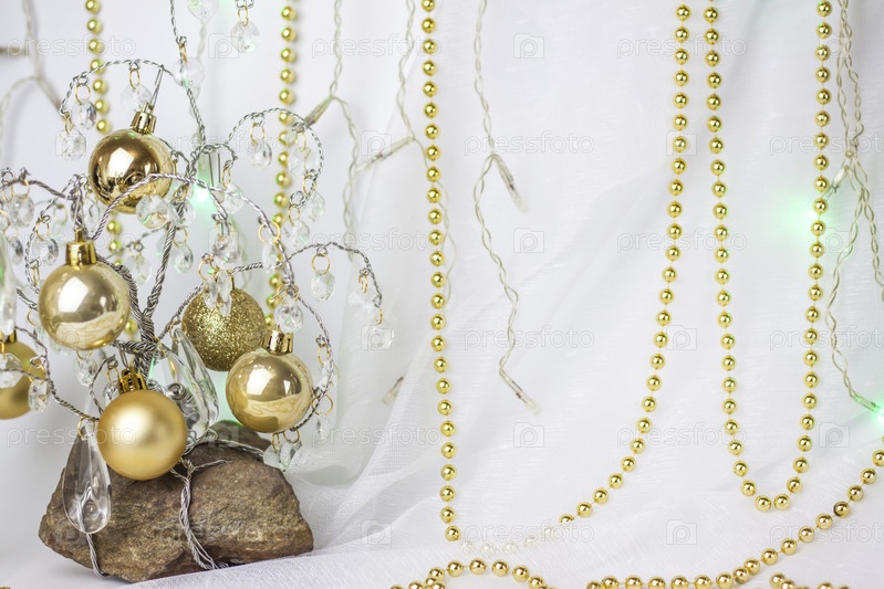 Новогодний фон с елкой, на которой висят маленькие золотые шарики. Выборочный фокус, картинка для фона. концепция Рождества и Нового года
