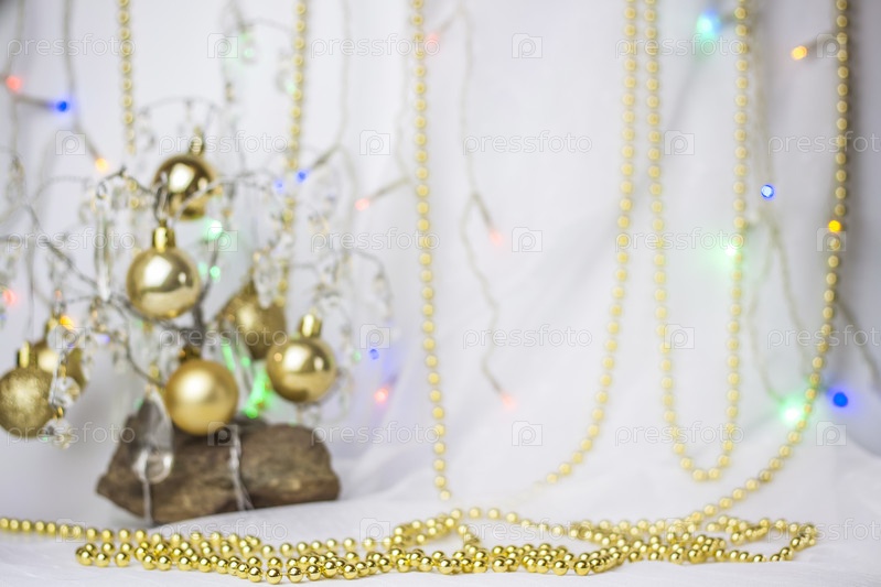 Новогодний фон с елкой, на которой висят маленькие золотые шарики. Выборочный фокус, картинка для фона. концепция Рождества и Нового года