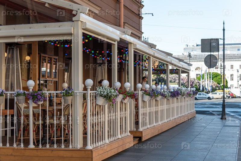 Санкт-Петербург, Россия, 2022: Кафе на летней террасе в городе