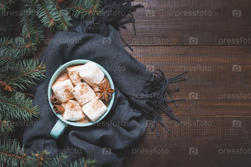 Рождественская кружка кофе с зефиром на темной деревянной доске. Новый год. Вид сверху и пространство для копирования