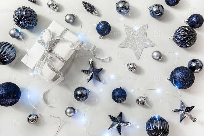 Рождественская композиция из классических синих шаров и подарочной коробки на сером фоне. Вид сверху. Рождество. Праздничная открытка. Цвет 2020 года