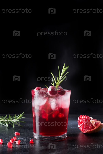 Гранатовый рождественский коктейль с розмарином, шампанским, содовой на сером бетонном столе