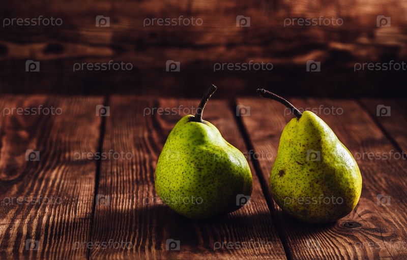 Две зеленые груши на деревянном фоне
