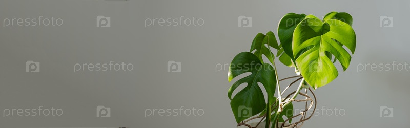 Баннер. цвет монстра в белом горшке на сером фоне. Концепция минимализма. Monstera deliciosa или швейцарская сыровая фабрика на фоне тропических листьев в горшке. резкие тени