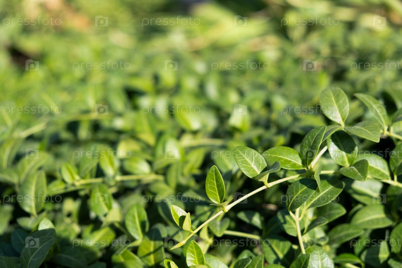 Зеленое растение барвинок, листья листвы природа фон, вид сверху. Свежая садовая абстрактная листва