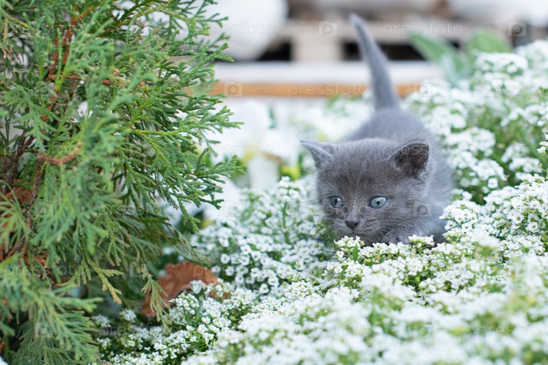 Маленький серый котенок одного месяца в саду. Кошка и зеленая трава и цветы