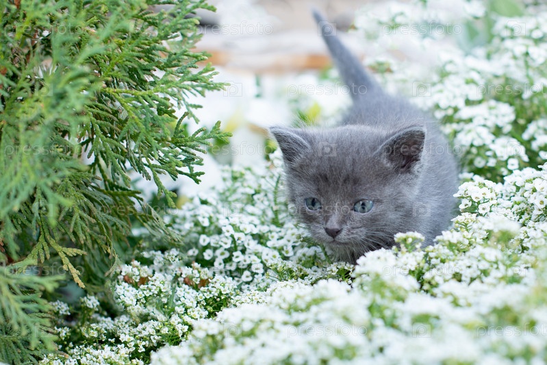 Маленький серый котенок одного месяца в саду. Кошка и зеленая трава и цветы
