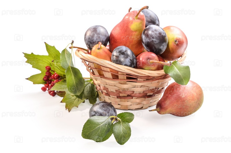 Фрукты и ягоды в корзине на белом фоне с мягкой тенью