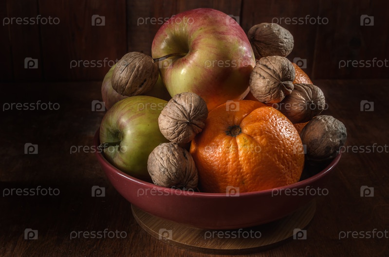 Орехи, апельсины и яблоки в миске на темном деревянном фоне