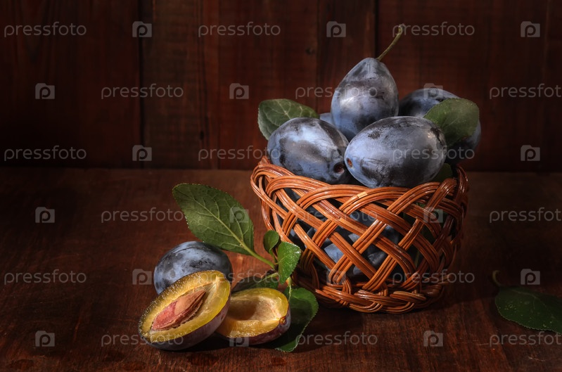 Слива в корзине на темном деревянном фоне в деревенском стиле