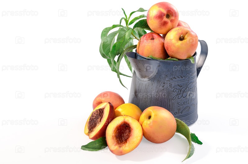 Нектарины в металлическом кувшине на белом фоне с мягкой тенью