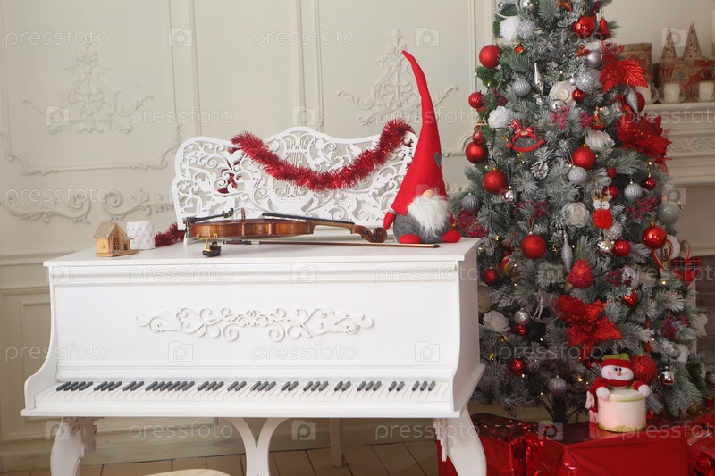 Белое пианино в новогодних декорациях