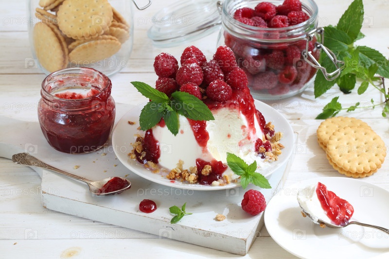 Рикотта с малиной и мятой на белом фоне