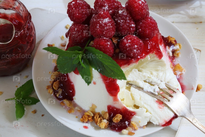 Рикотта с малиной и мятой на белом фоне