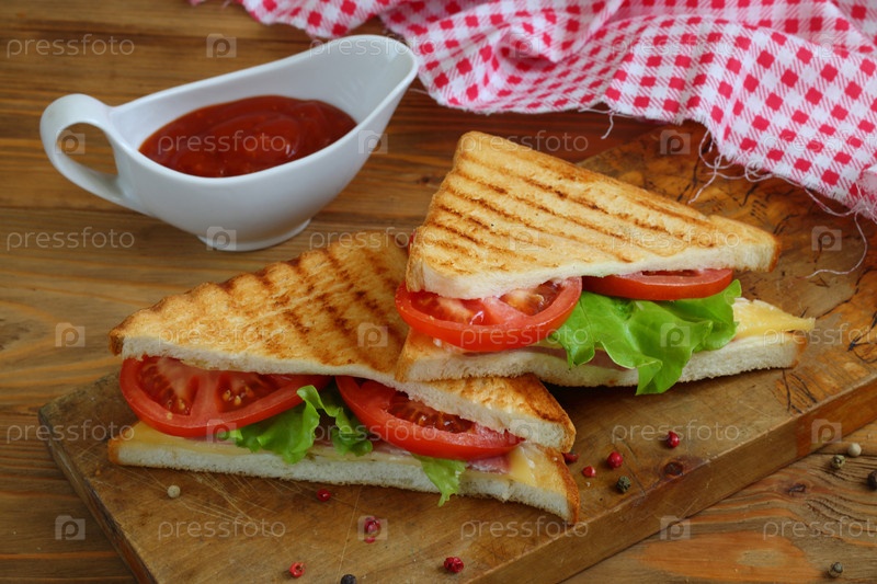 Сэндвич с помидорами, сыром и ветчиной на темном деревянном фоне