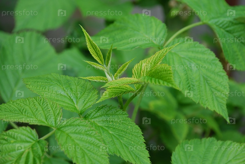 Несколько зеленых листьев малины