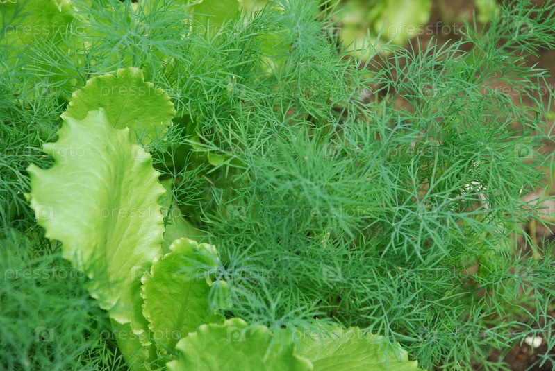 Большие листья зеленого салата и укроп