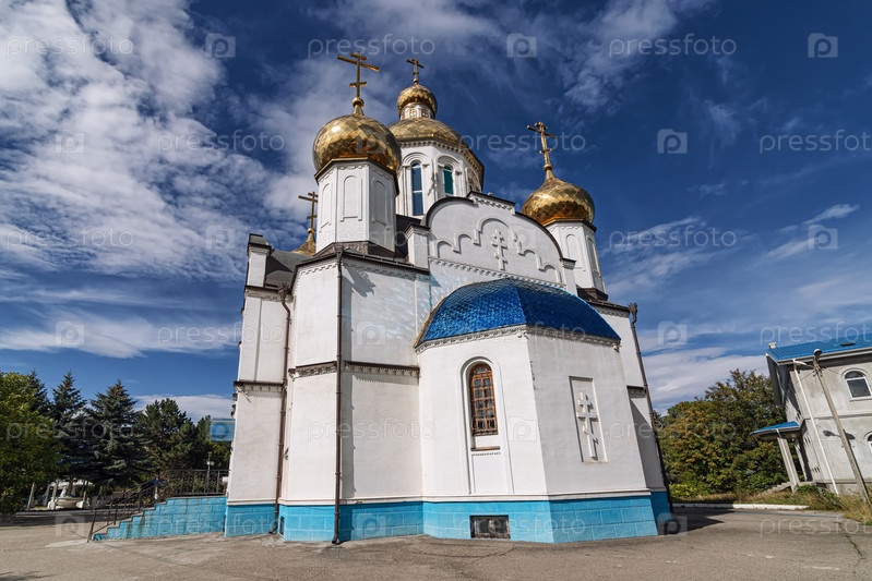 Вид на церковь Успения Пресвятой Богородицы в станице Ессентукской. Фото сделано на широкоугольный объектив