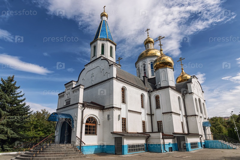 Вид на церковь Успения Пресвятой Богородицы в станице Ессентукской. Фото сделано на широкоугольный объектив