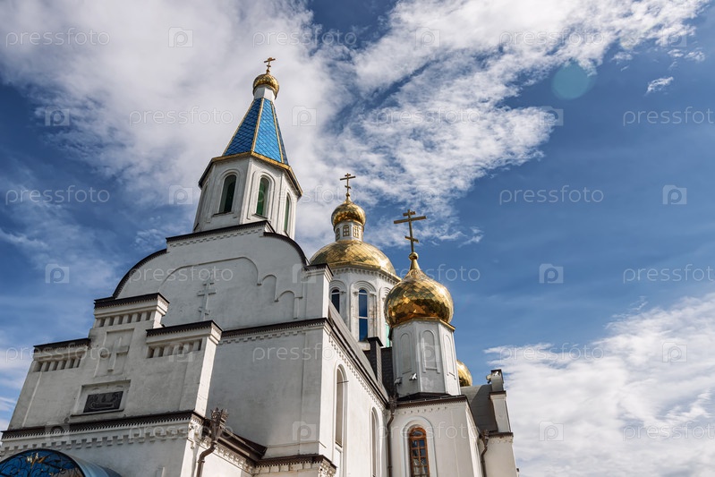 Вид на церковь Успения Пресвятой Богородицы в станице Ессентукской. Фото сделано на широкоугольный объектив