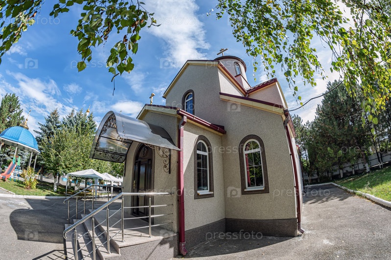 Небольшая часовня на территории Русской православной церкви с золотым куполом и крестом