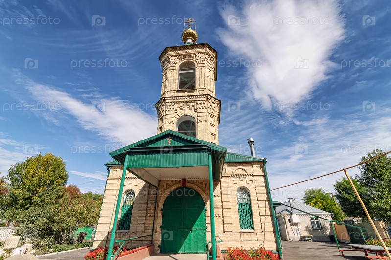 Здание старой кирпичной старообрядческой церкви с высокой колокольней. Фото сделано широкоугольным объективом