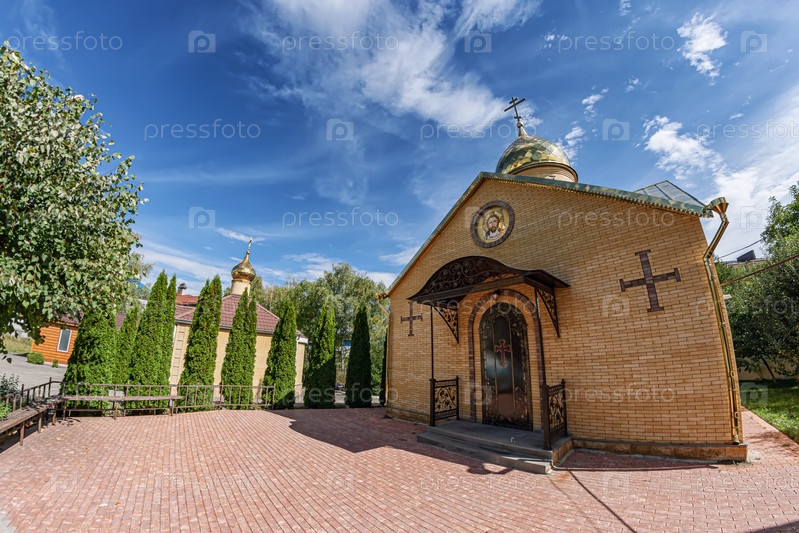 Небольшая часовня на территории Русской православной церкви с золотым куполом и крестом