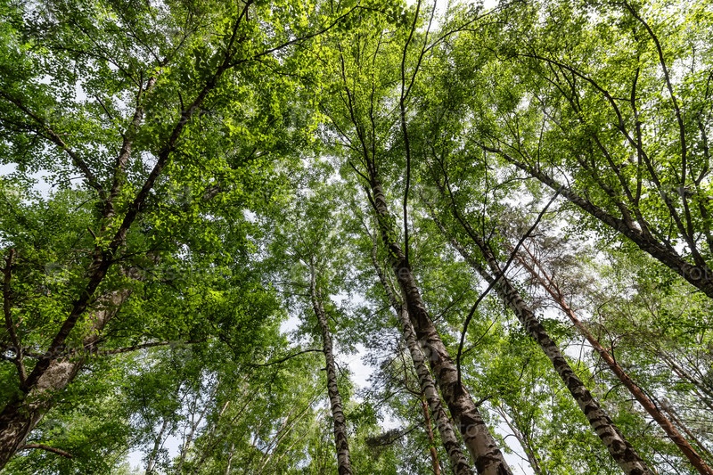 Вид снизу вверх на кроны высоких деревьев в диком лесу