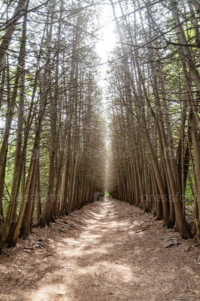 Дорога, идущая вдаль в лесу со стенами деревьев без листьев