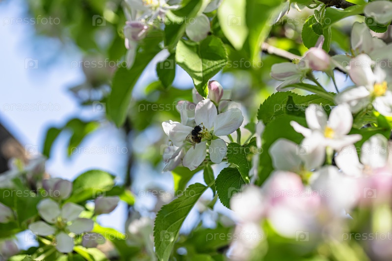 Пчелы опыляют маленькие белые цветки фруктовых деревьев в саду