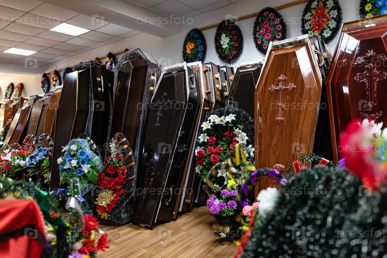 Внутри магазина ритуальных услуг деревянные гробы и венки со сверкающими цветами