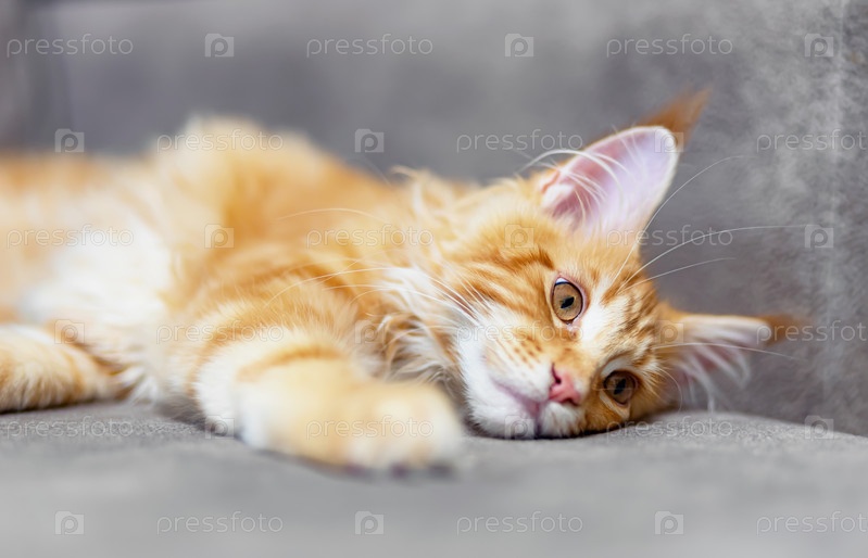 Очаровательный рыжий кот породы Мэн потягивается после сна