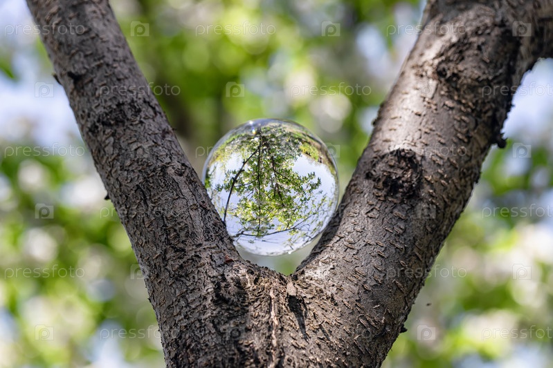 Отражение большого цветка вишни в хрустальном шаре между ветвями