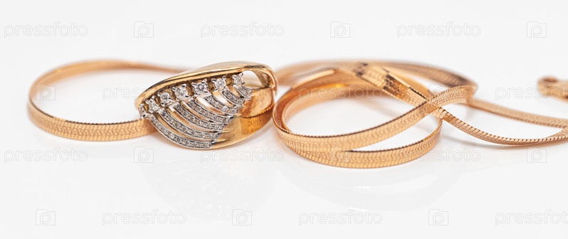 Обручальное кольцо из золота и цепочки различного плетения на белой отражающей поверхности