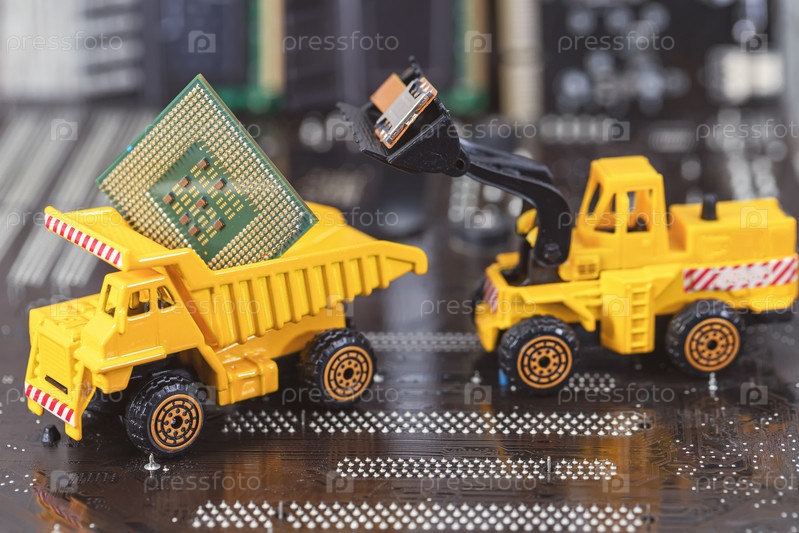 Желтый игрушечный бульдозер загружает старые компьютерные детали в кузов игрушечного грузовика для переработки