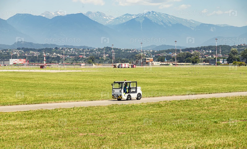 Специальная машина для обслуживания аэропортов. Аэропорт расположен недалеко от гор