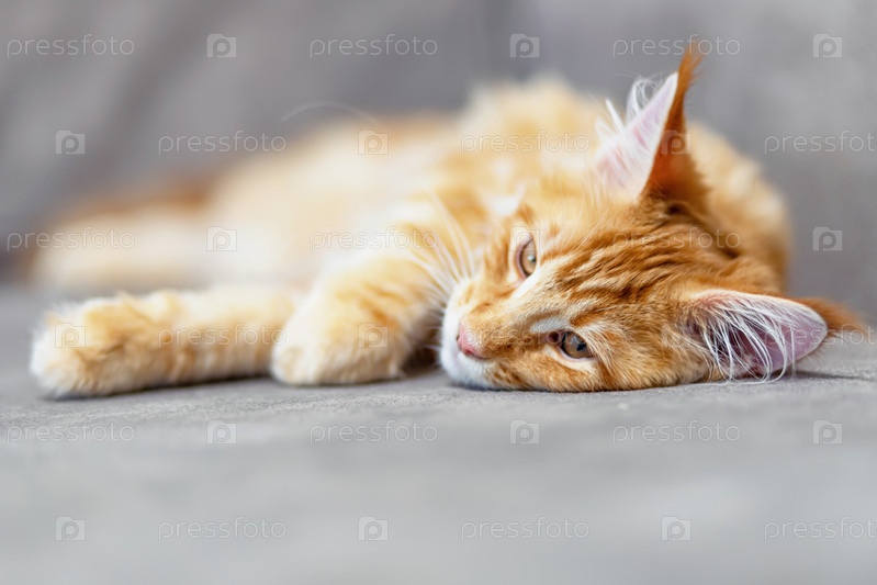 Большой рыжий кот мейн-кун дремлет на подоконнике за занавеской