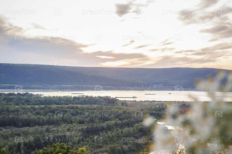 Закат на реке Волге. Природный ландшафт. отражение, голубое небо и желтый солнечный свет. пейзаж во время заката
