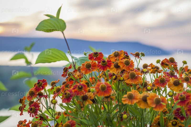Дикие яркие цветы на фоне красивого заката. Природный ландшафт. голубое небо и желтый солнечный свет. пейзаж во время заката
