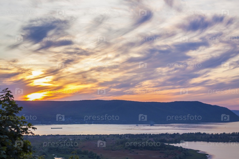 Закат на реке Волге. Природный ландшафт. отражение, голубое небо и желтый солнечный свет. пейзаж во время заката