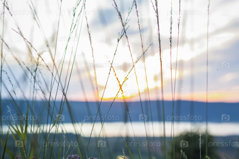 Летний абстрактный фон природы с травой на лугу и закатным небом позади. Природный ландшафт. Макросъемка травинок. пейзаж во время заката