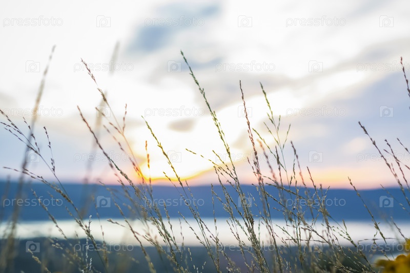 Летний абстрактный фон природы с травой на лугу и закатным небом позади. Природный ландшафт. Макросъемка травинок. пейзаж во время заката