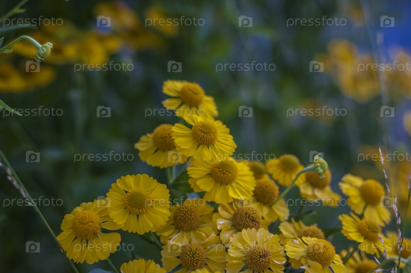 Дикие яркие цветы на фоне красивого заката. Природный ландшафт. голубое небо и желтый солнечный свет. пейзаж во время заката