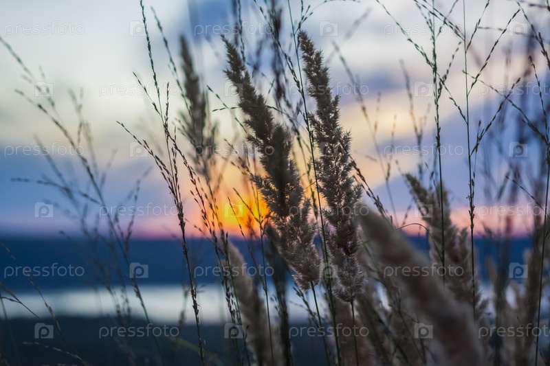 Летний абстрактный фон природы с травой на лугу и закатным небом позади. Природный ландшафт. Макросъемка травинок. пейзаж во время заката
