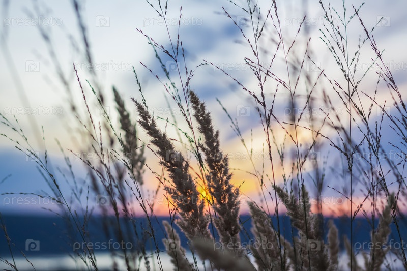 Летний абстрактный фон природы с травой на лугу и закатным небом позади. Природный ландшафт. Макросъемка травинок. пейзаж во время заката