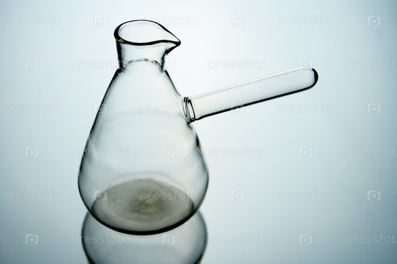 Стеклянная колба в химической лаборатории изолирована на сером фоне
