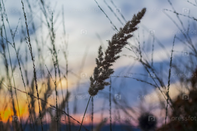 Летний абстрактный фон природы с травой на лугу и закатным небом позади. Природный ландшафт. Макросъемка травинок. пейзаж во время заката